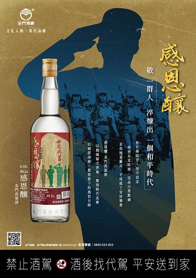 感恩釀金門高粱酒是一瓶充滿無限「感謝的佳釀」,感恩一群人曾經犧牲、貢獻的艱辛,長達36年「政地戰務」期間隨時待命,保護我們民主、自由與和平,他們是時代的寫照,也是歷史的記憶。酒標設計以最具代表性的「毋忘在莒」的標誌,並輔以軍人保家衛國英勇之姿的剪影,致敬那非常時期的時代。